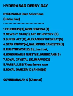 HYDERABAD RACE SELECTIONS (18/08/25) ******************************* 1) CERTANITY (6), TOOTSIE DARLING (8) 2) ZUZA (1), STAR MEDAL (4) 3)...